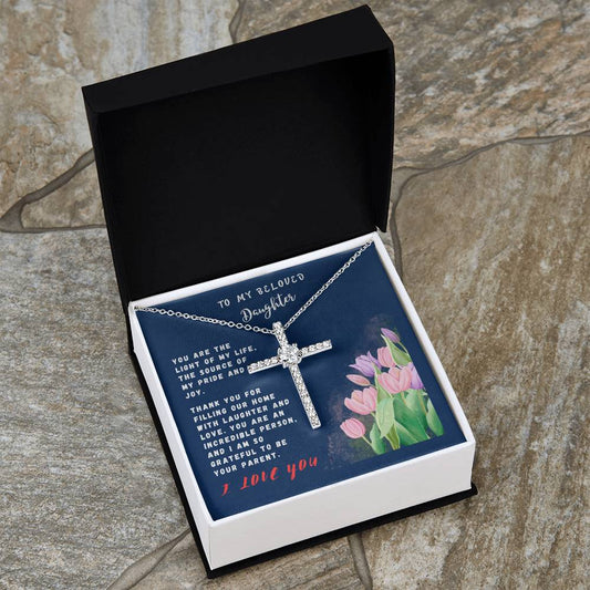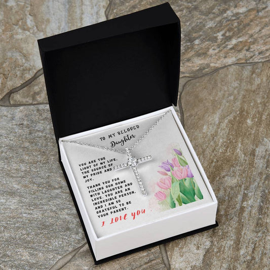 Daughter Gift Necklace - Crystal Cross Necklace - Roses White Card