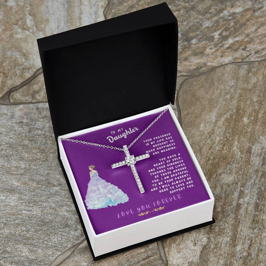 Daughter Gift Necklace - Crystal Cross Necklace - Your Presence In My Life Purple Card