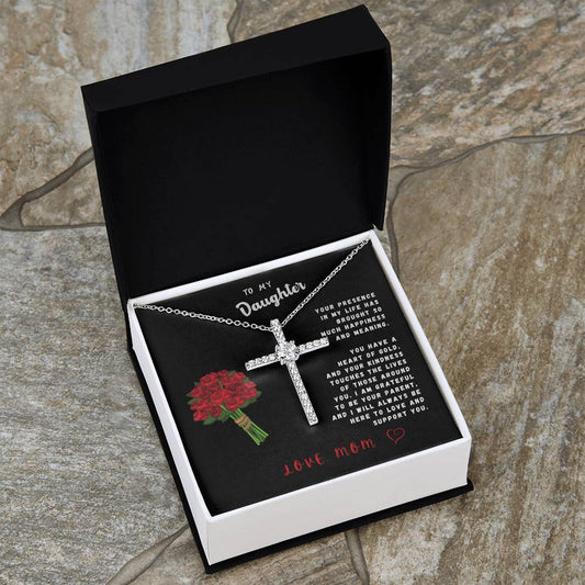 Daughter Gift Necklace - Crystal Cross Necklace - Roses Black Card