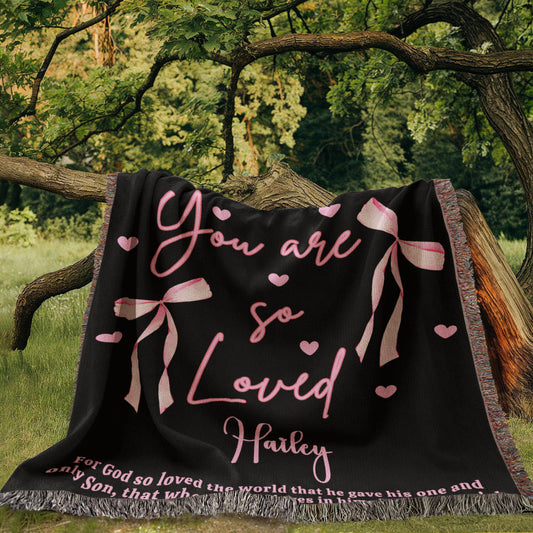 Personalized Woven Blanket, Pink Bow Throw Blanket, Custom Name & Bible Verse Blanket, Girlfriend Daughter Granddaughter Gift Valentine Gift