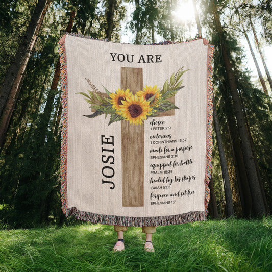Personalized Woven Blanket with Sunflower Cross Custom Name Throw Blanket Christian Gift For for Women Teens Baptism Birthday Valentine Gift